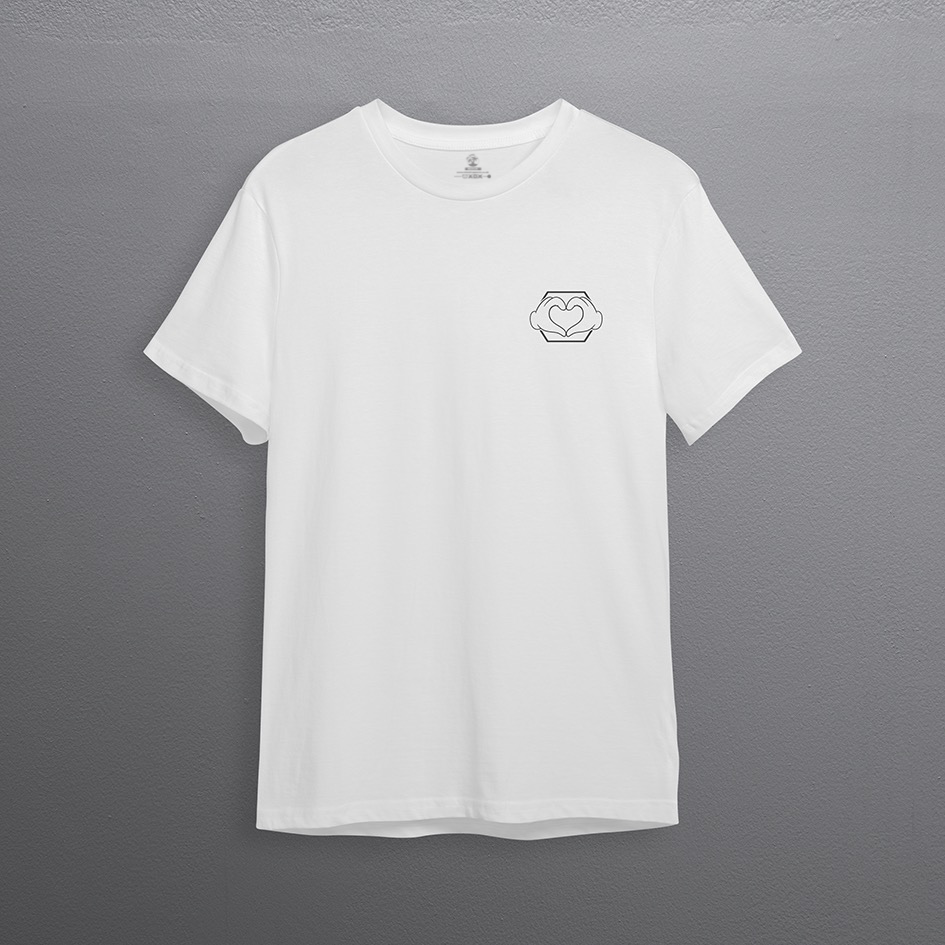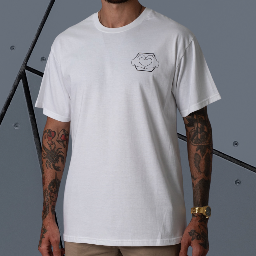 White 100% Cotton heavy crew neck T-Shirt with Love hand logo.